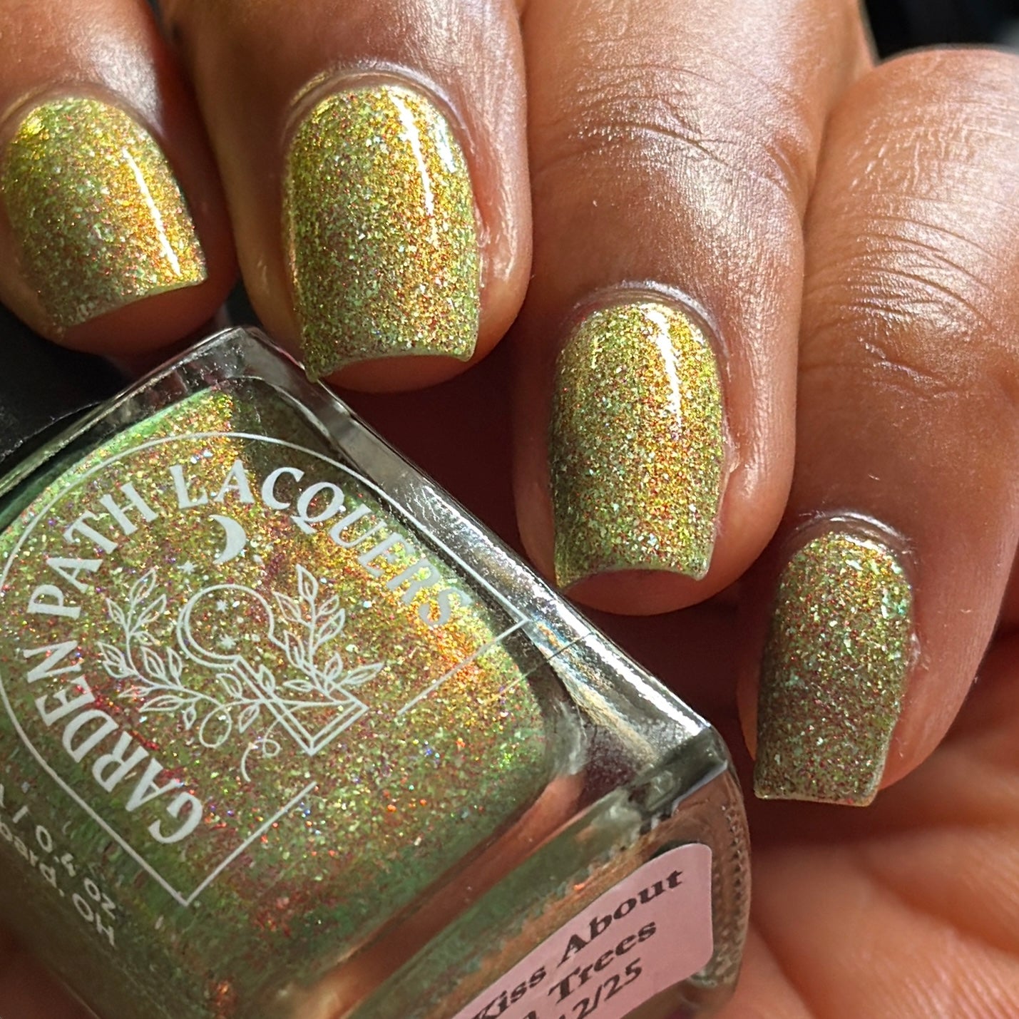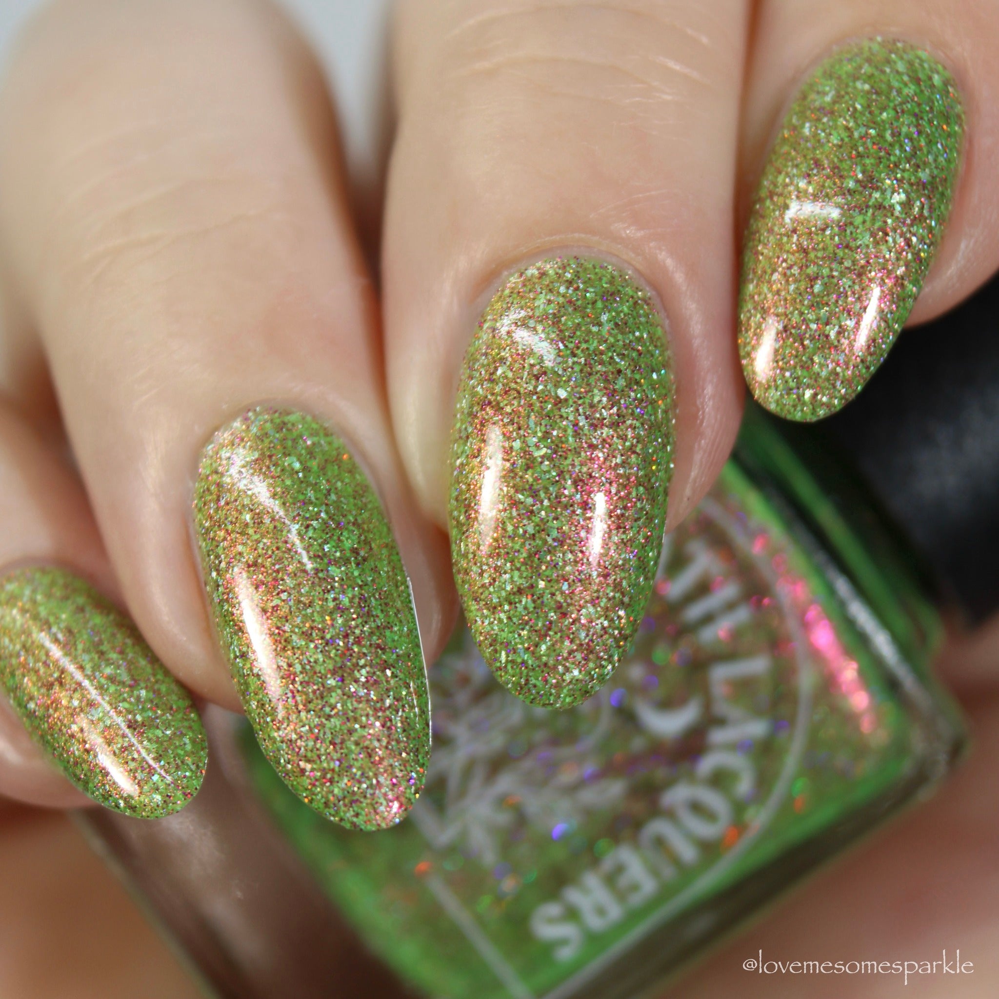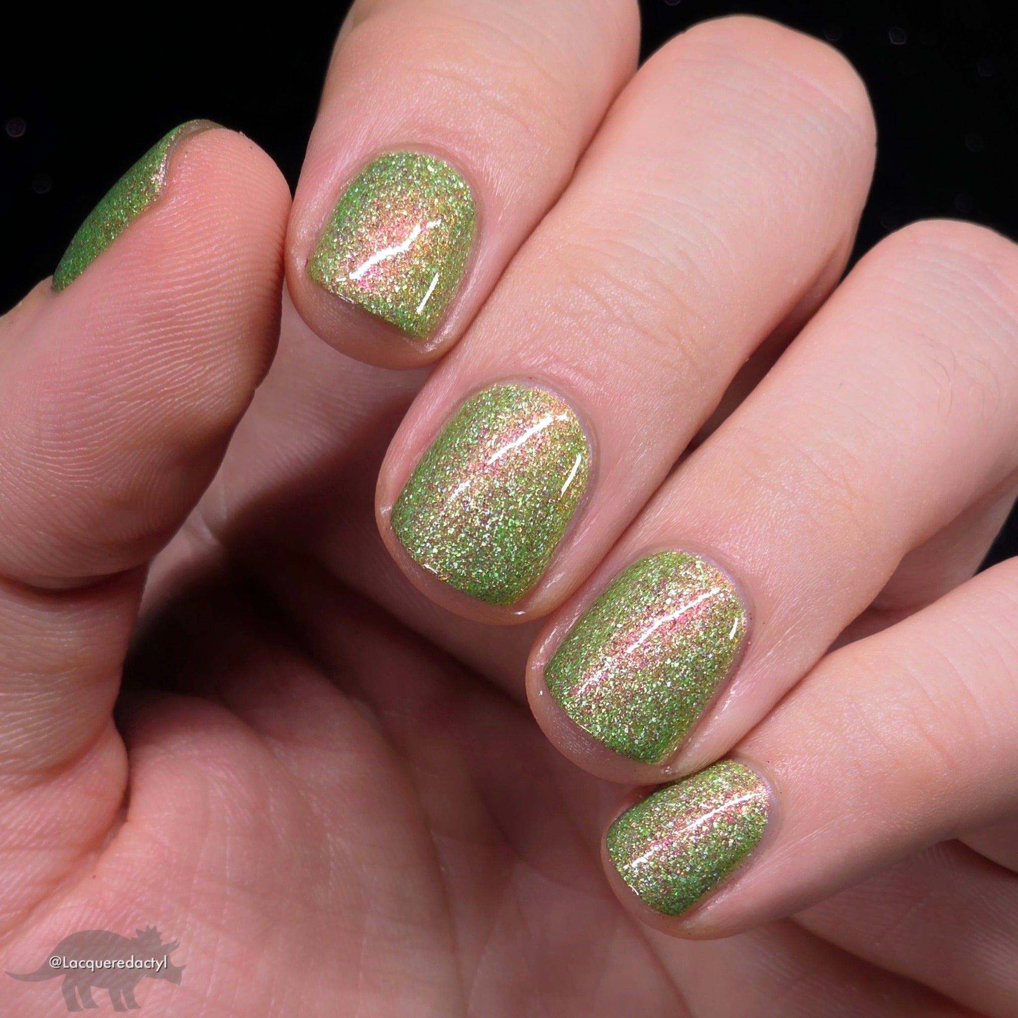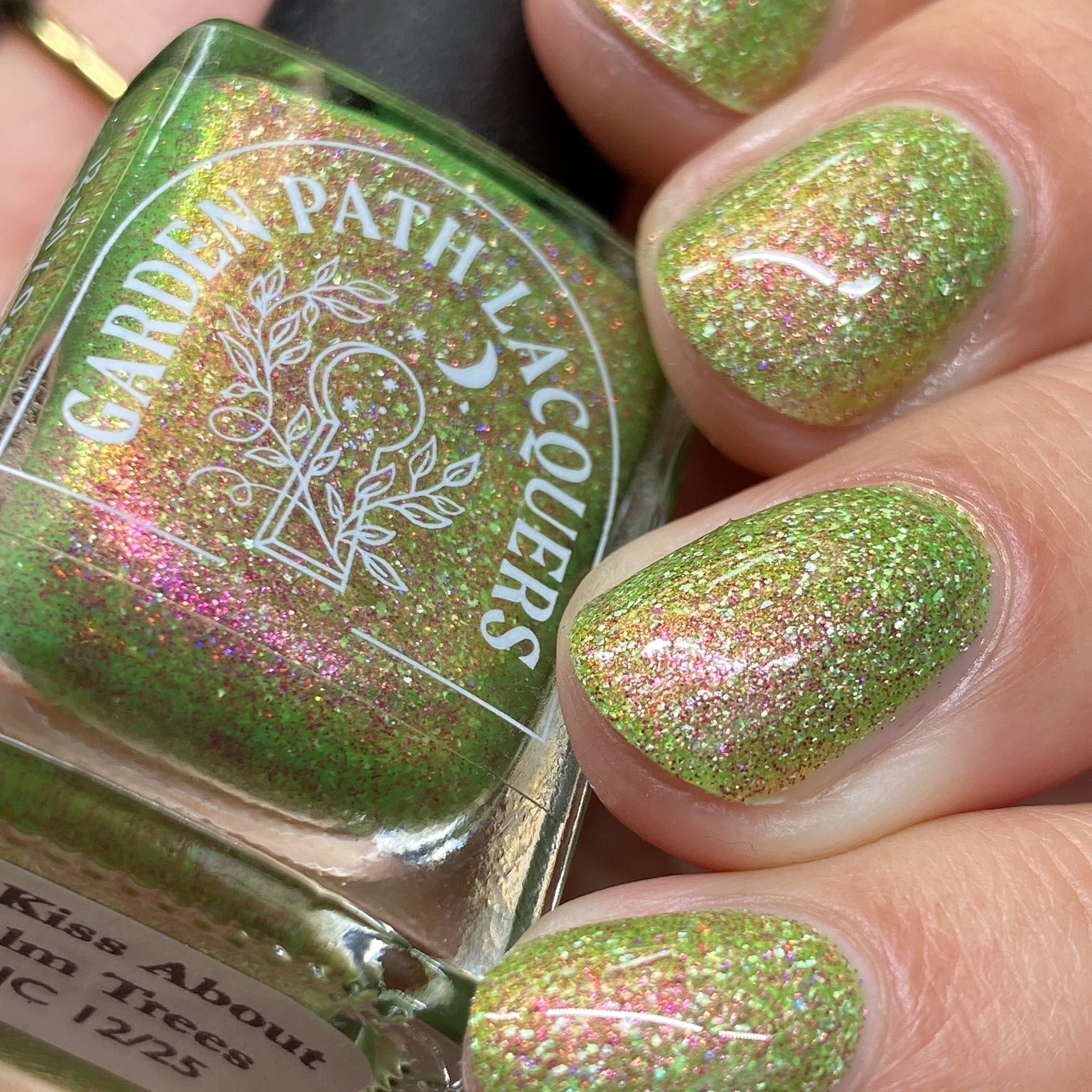 "A Kiss About Palm Trees" has a bright grassy green crelly base accented with pink/gold shifting Aurora shimmer, light pink and fuchsia holographic microglitters, and holographic microflakes.