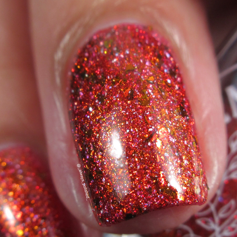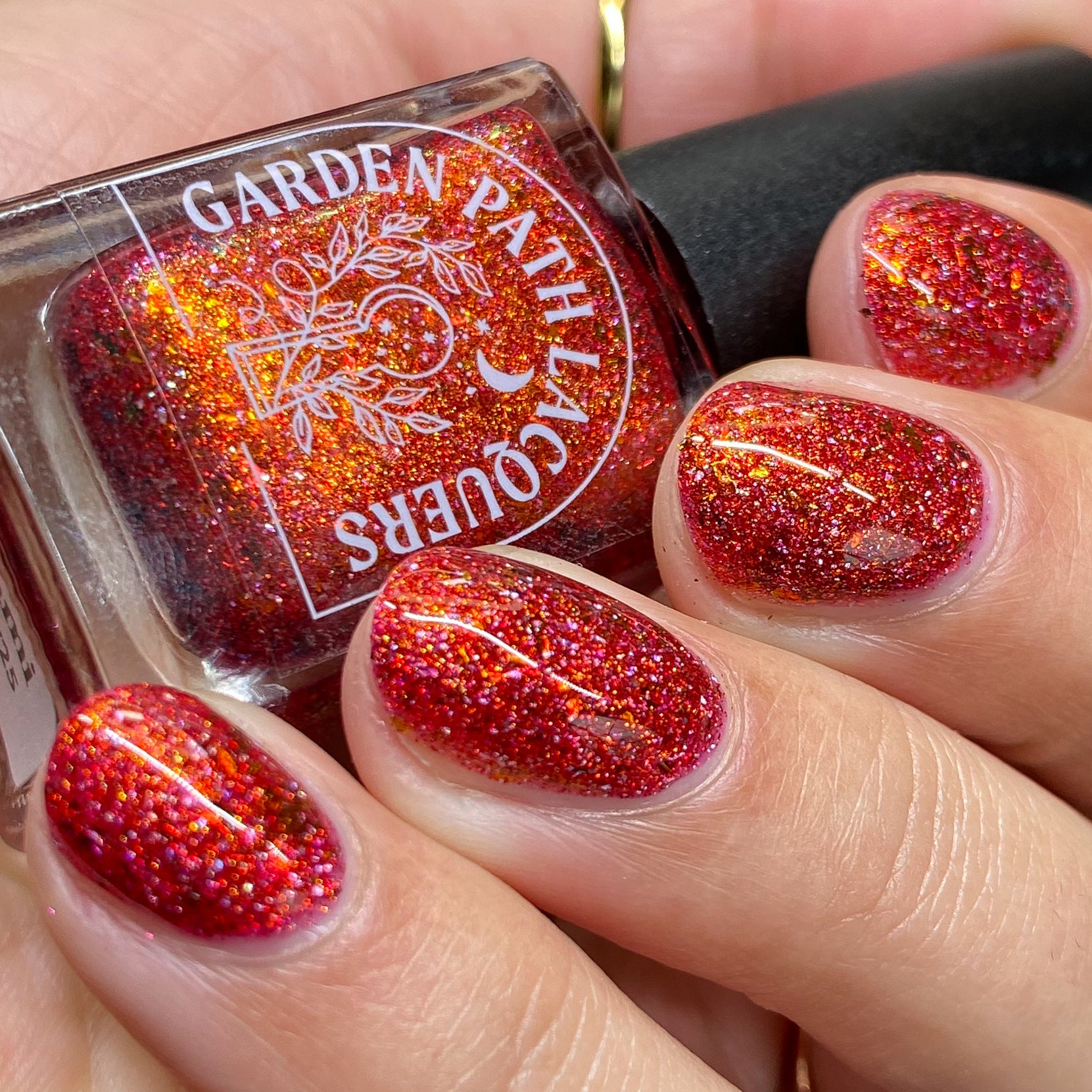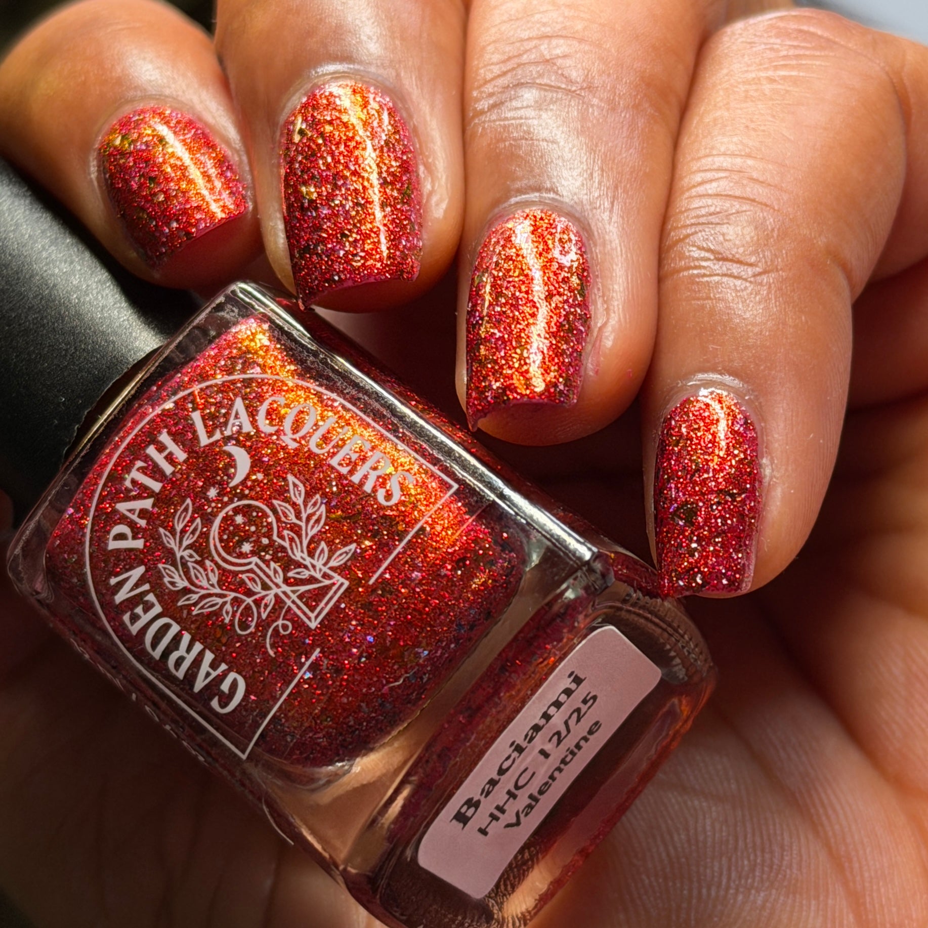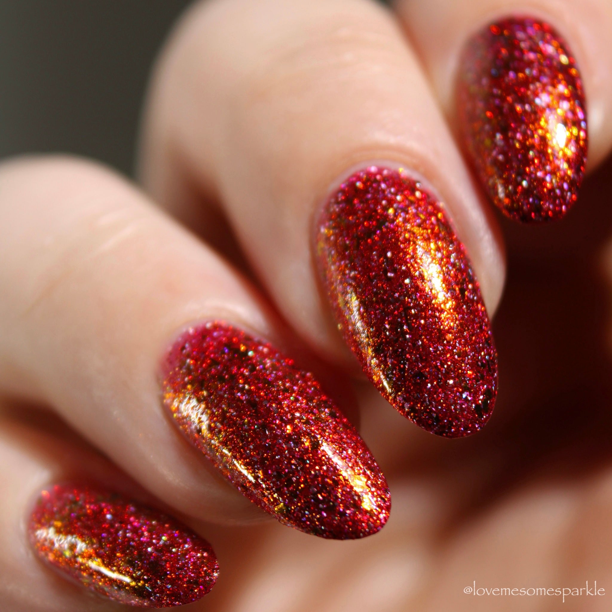 "Baciami" (Italian for "kiss me") has a warm red crelly base filled with red holographic microglitter, gold Aurora shimmer, red-orange ultra chameleon chrome flakes, and holographic microflakes.