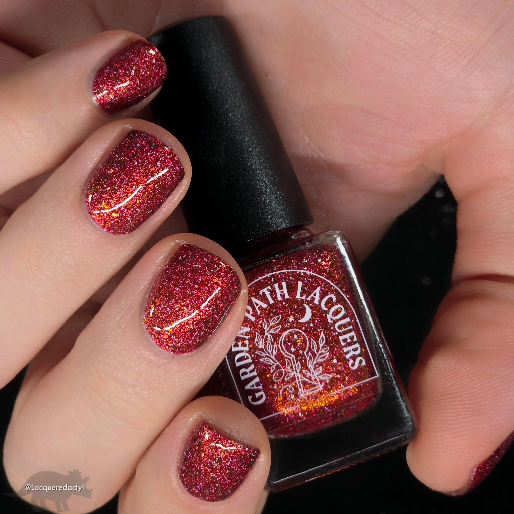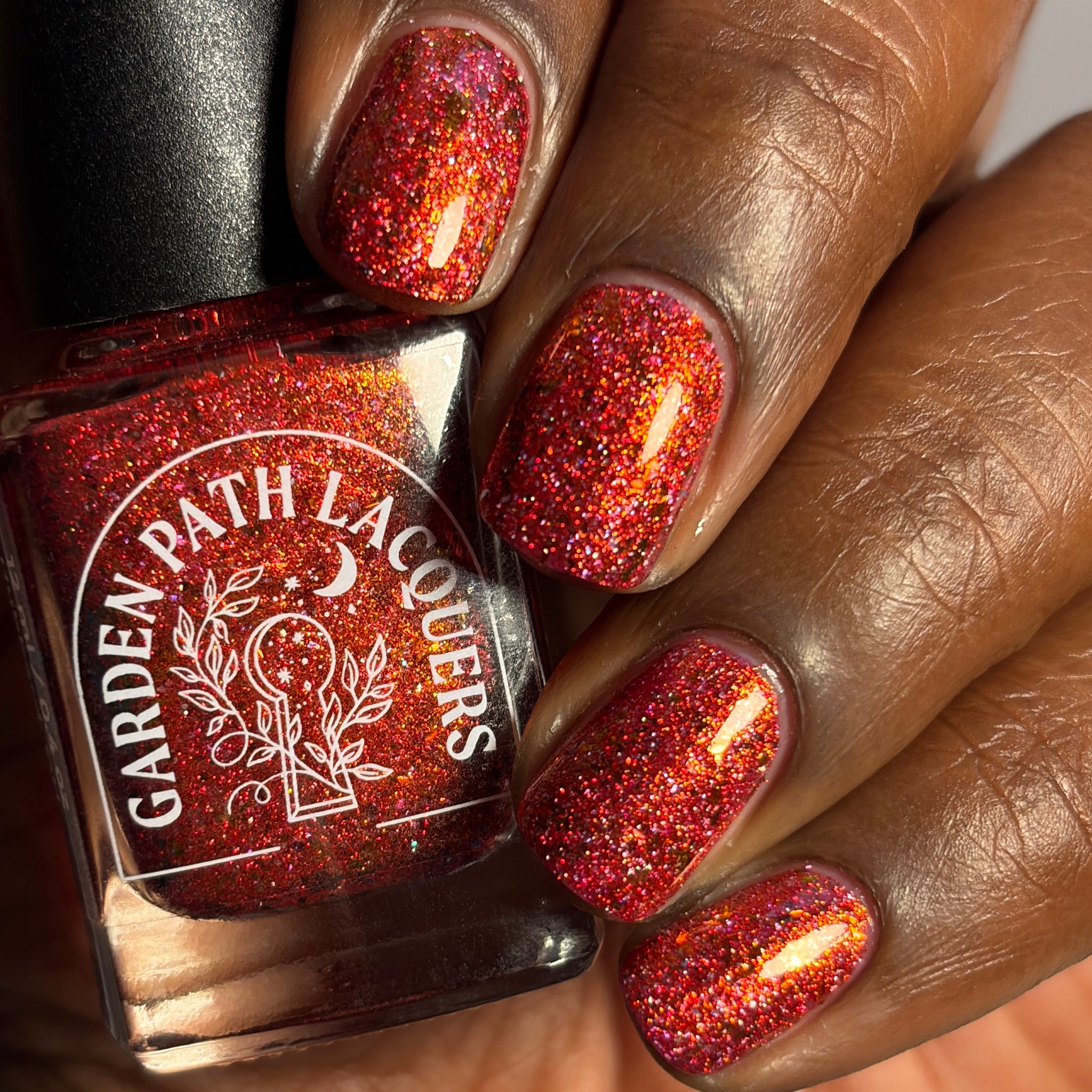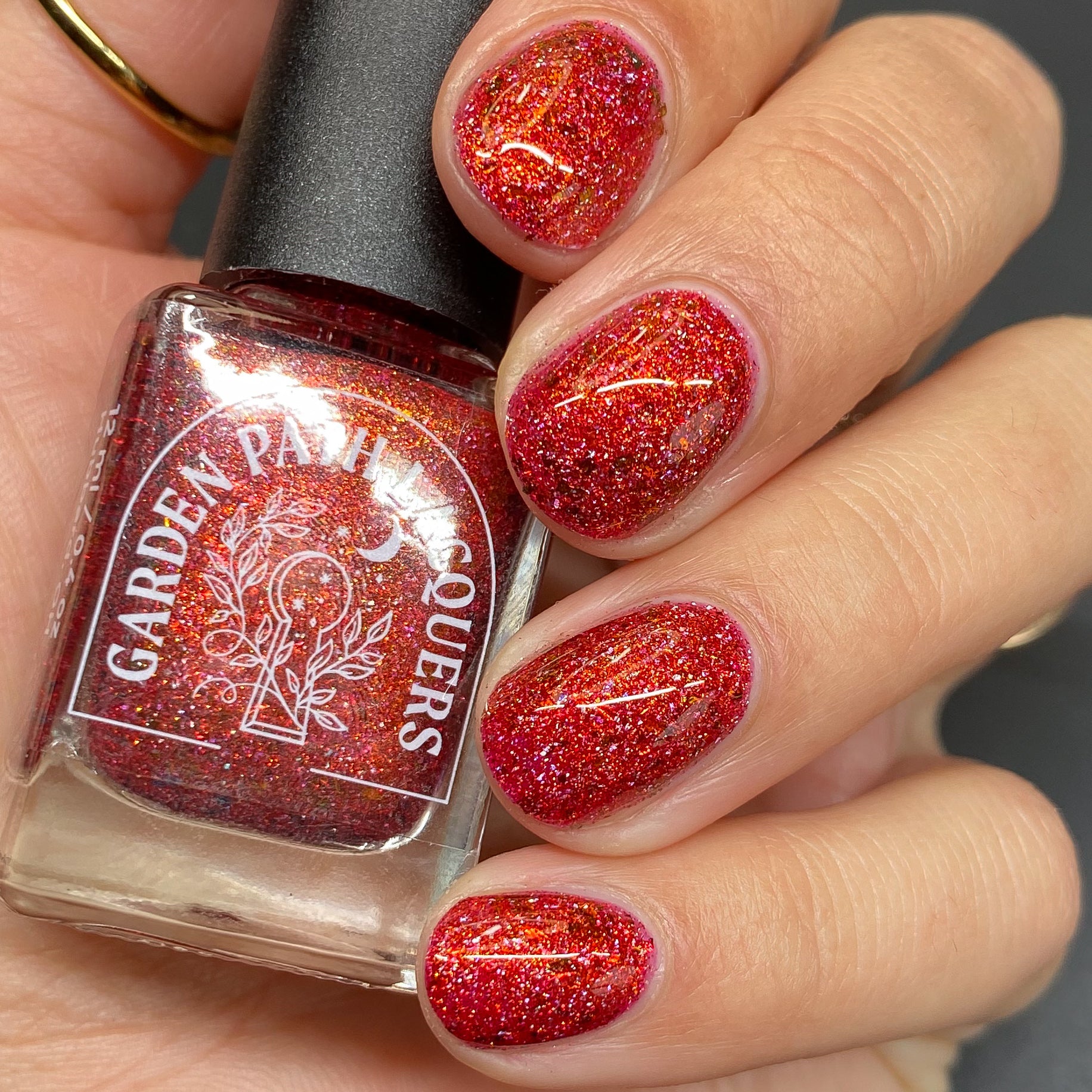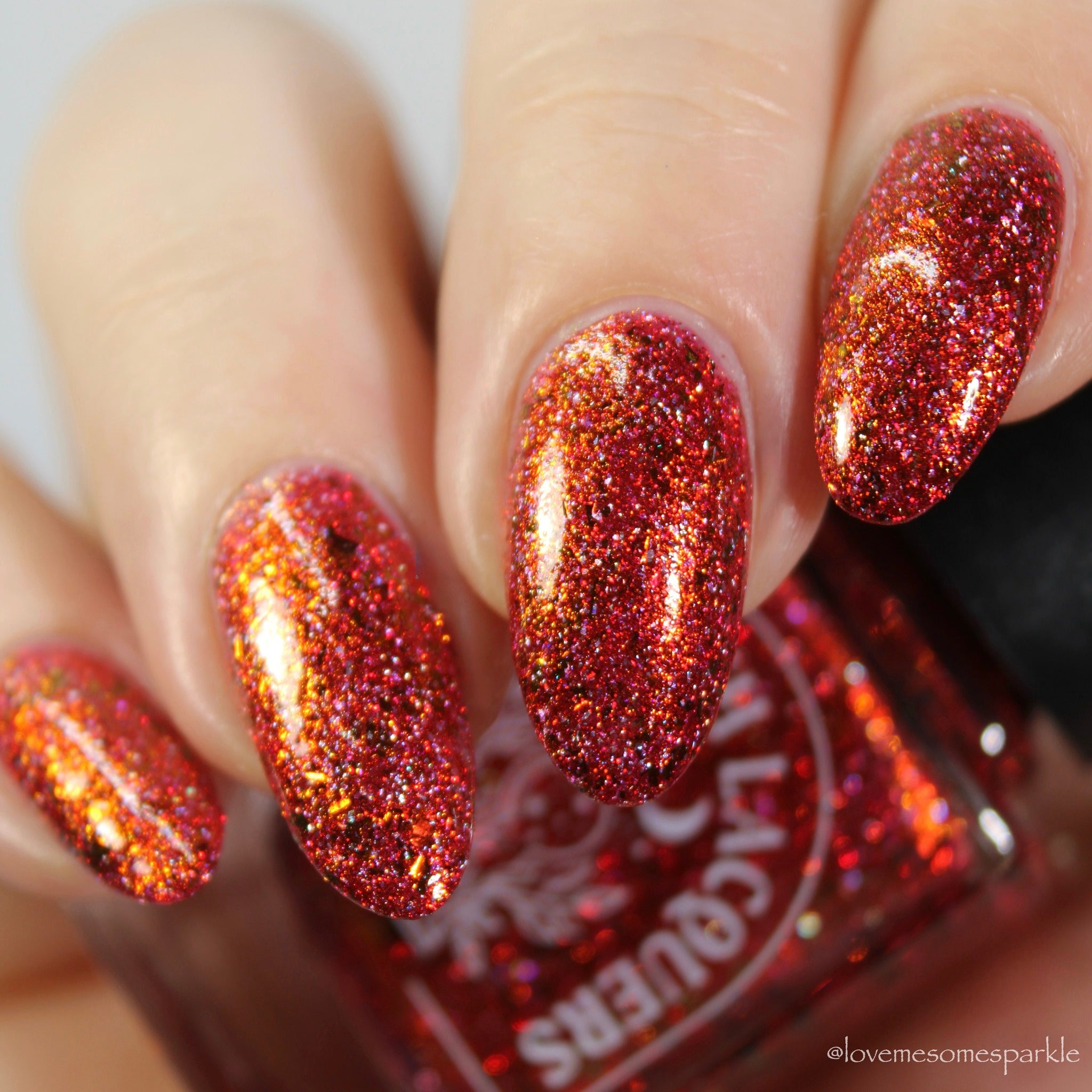 "Baciami" (Italian for "kiss me") has a warm red crelly base filled with red holographic microglitter, gold Aurora shimmer, red-orange ultra chameleon chrome flakes, and holographic microflakes.