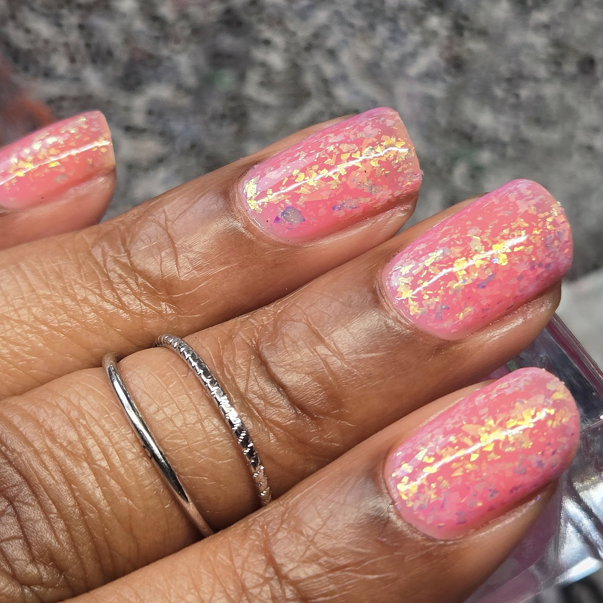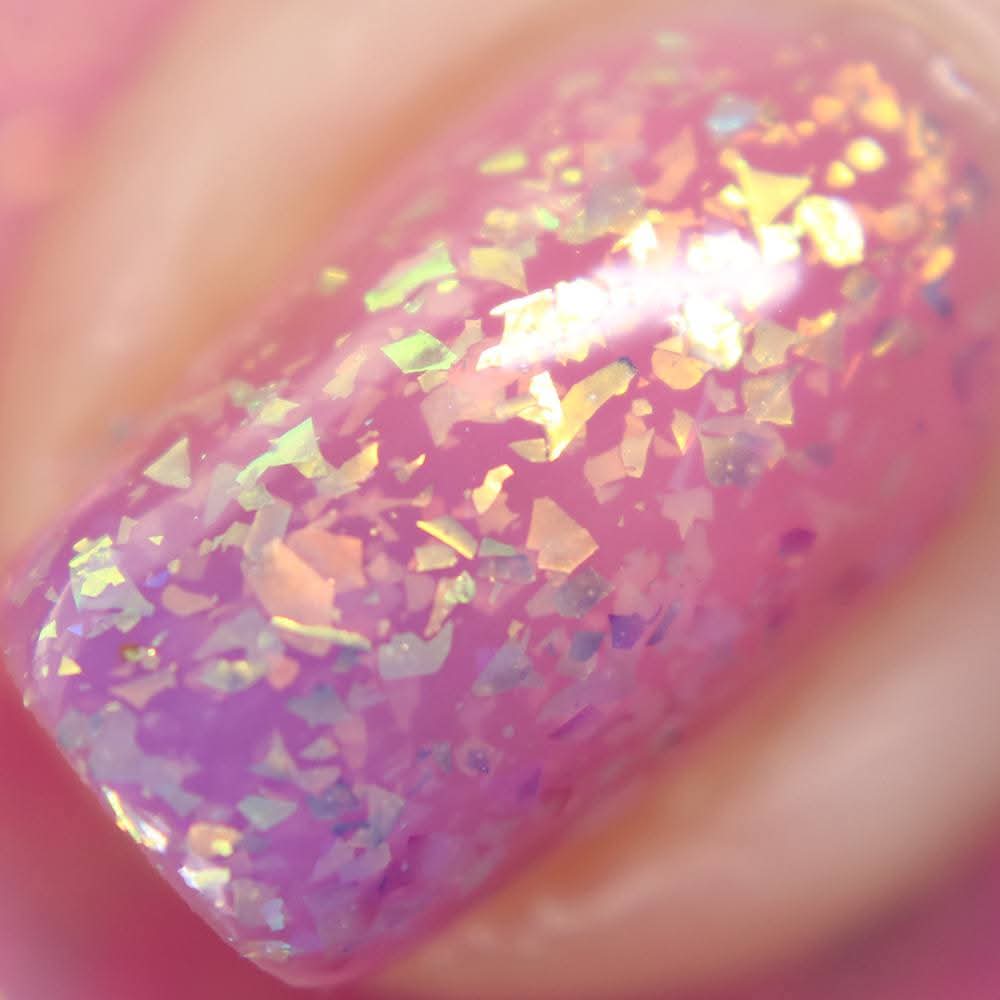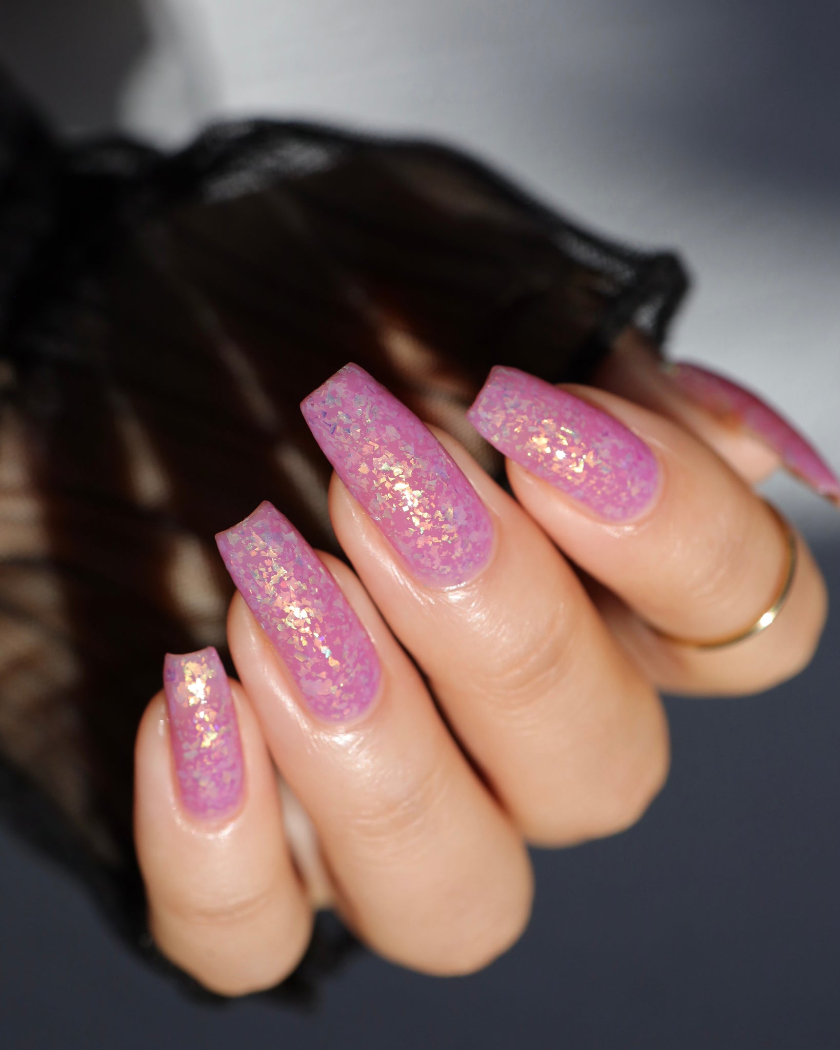 "Pixel-Perfect" is a UV reactive polish that shifts from a soft pink to mauve (in sunlight) to dreamy pastel lavendar (UV light). Its gold/copper crystal flakies complete the polish for a pixel-perfect finish.