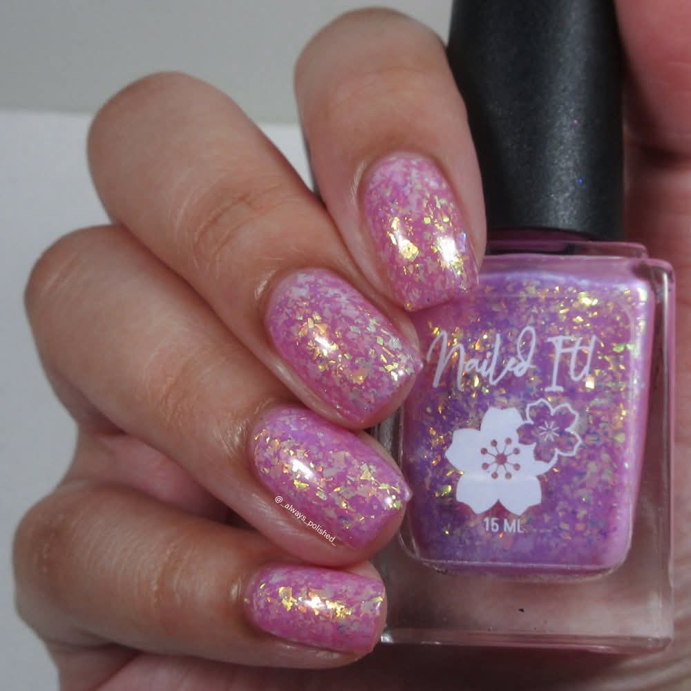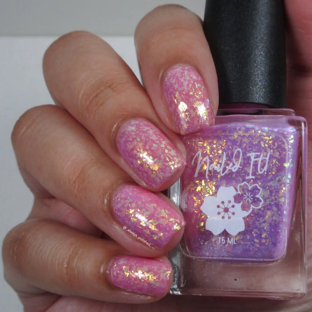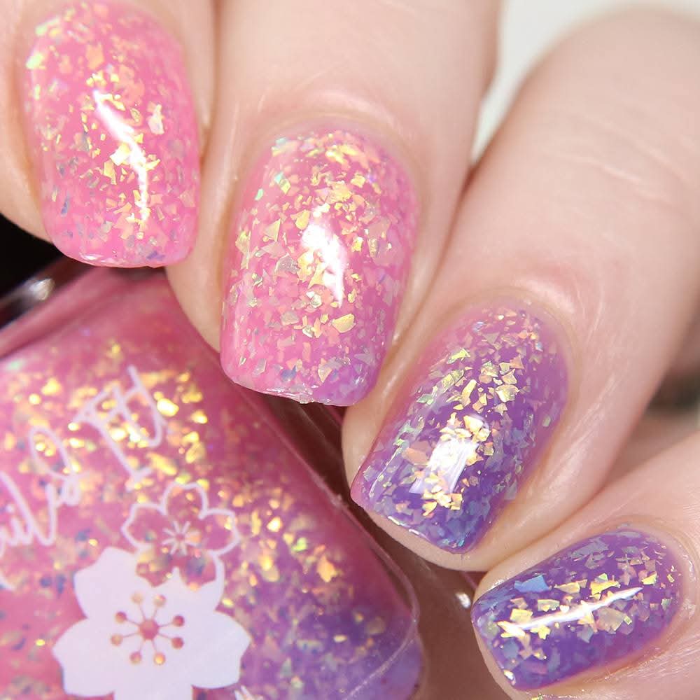 "Pixel-Perfect" is a UV reactive polish that shifts from a soft pink to mauve (in sunlight) to dreamy pastel lavendar (UV light). Its gold/copper crystal flakies complete the polish for a pixel-perfect finish.