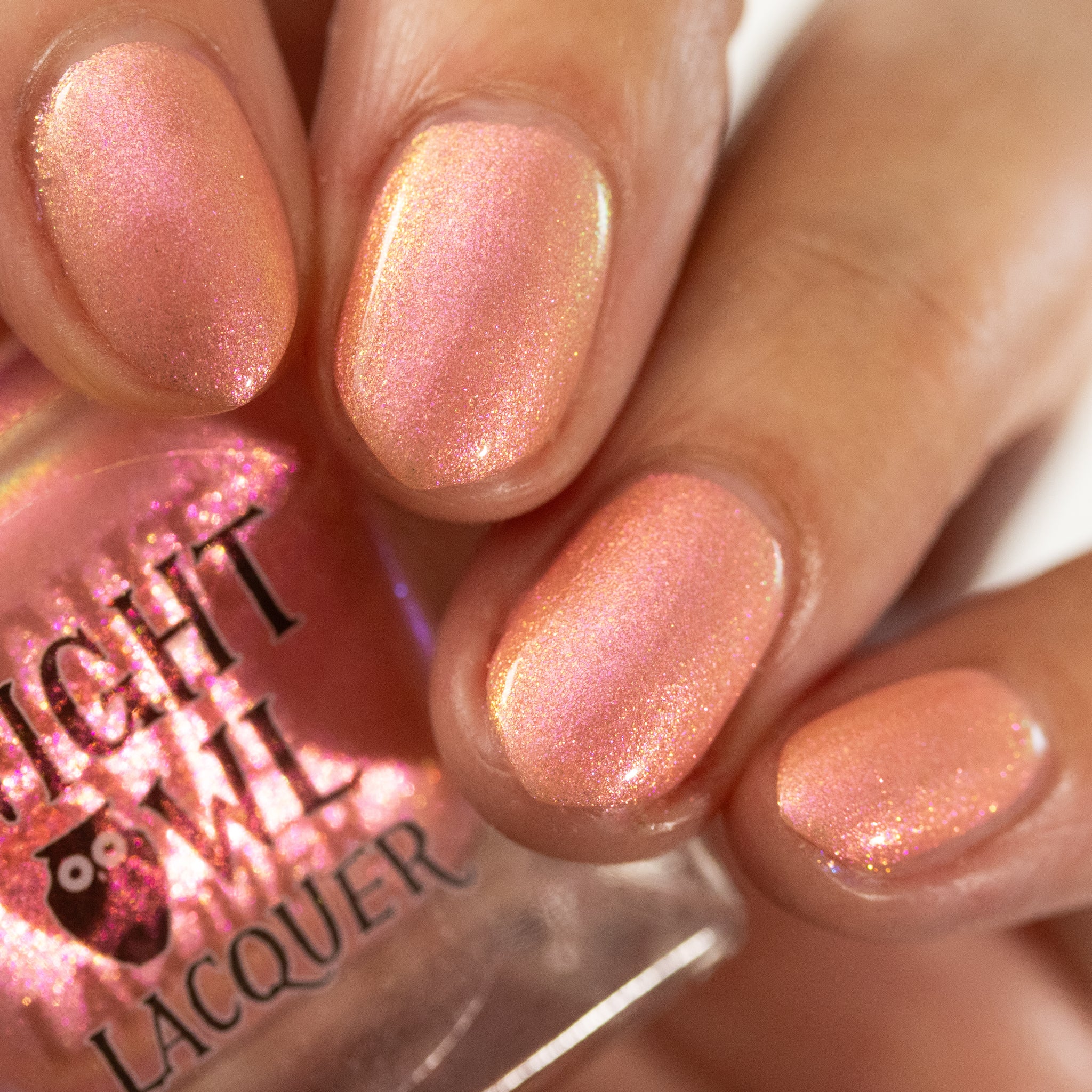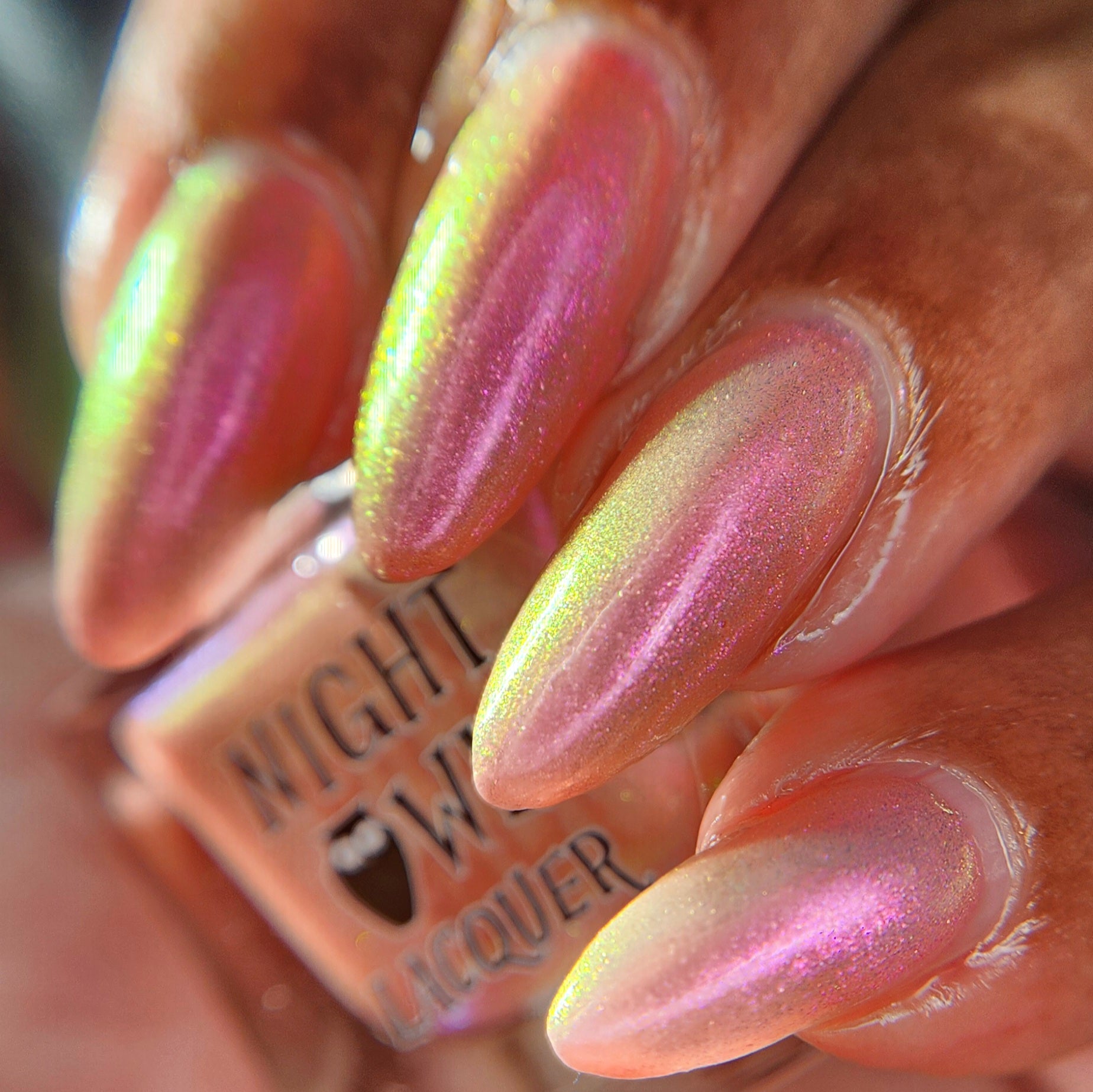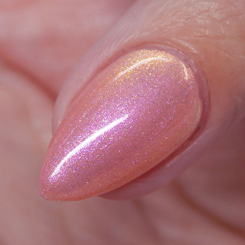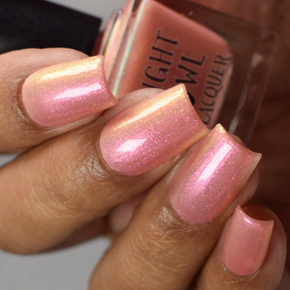 "Chafing My Honkers" is a peach glowing with iridescent shimmer that shifts violet/pink/peach/gold/green.