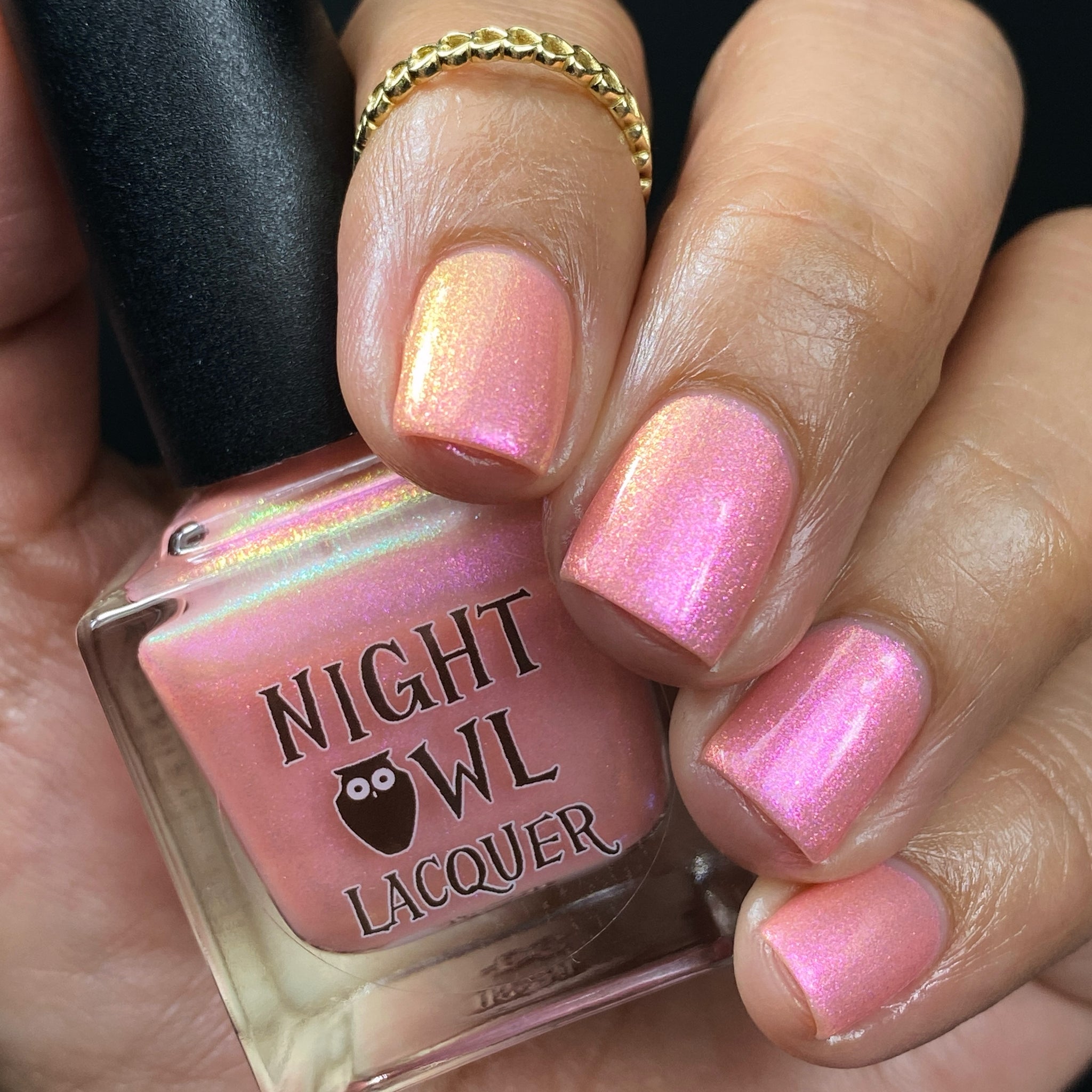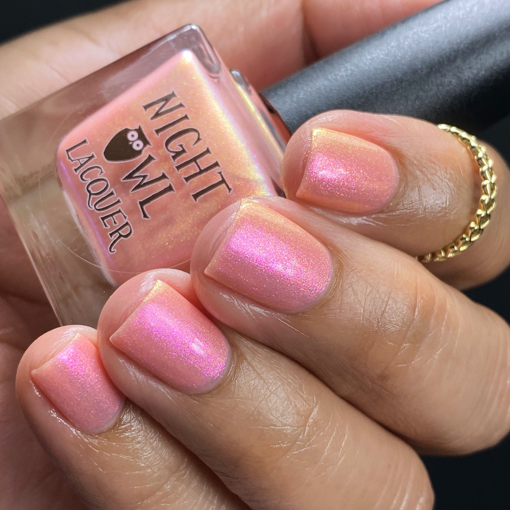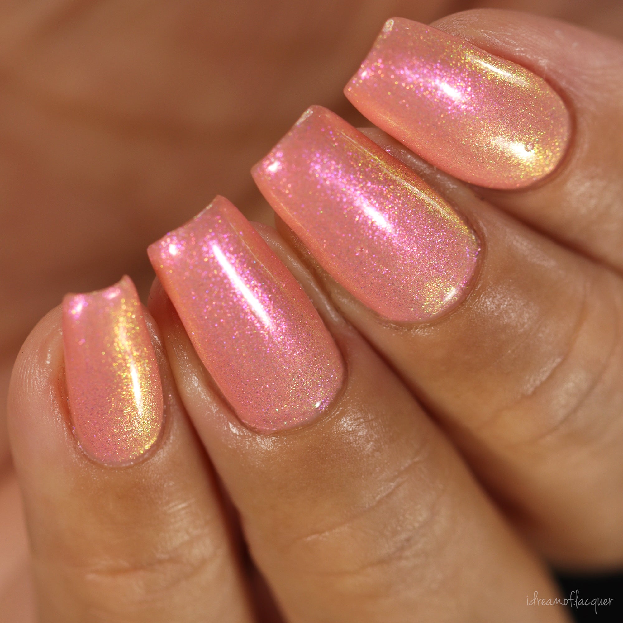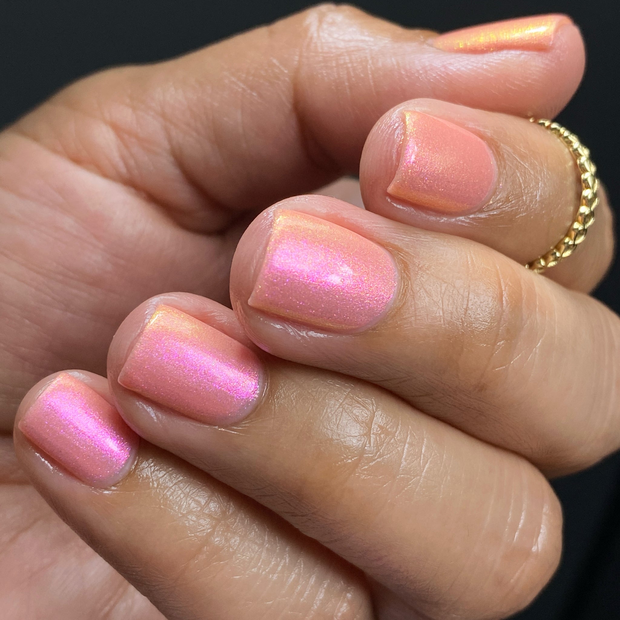 "Chafing My Honkers" is a peach glowing with iridescent shimmer that shifts violet/pink/peach/gold/green.