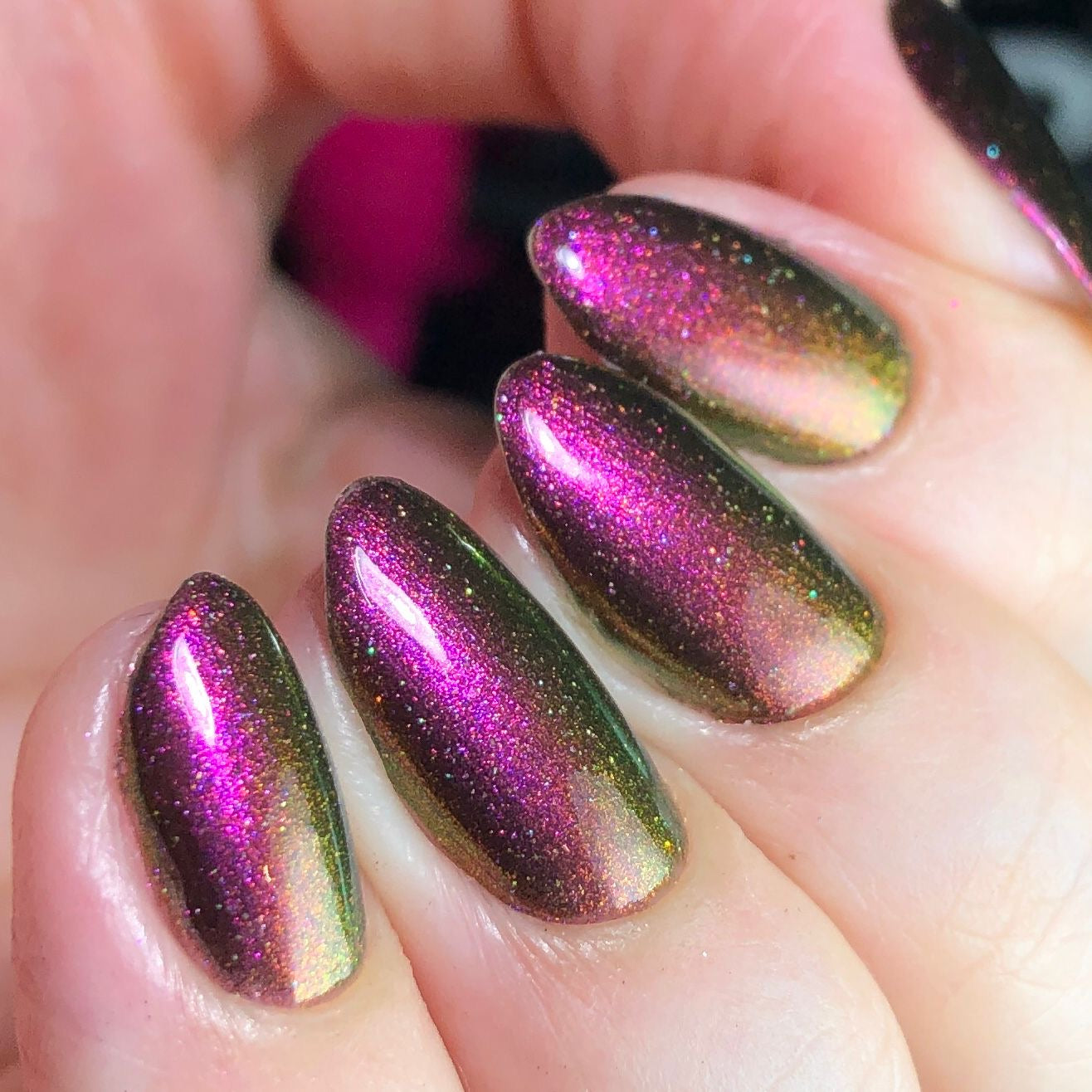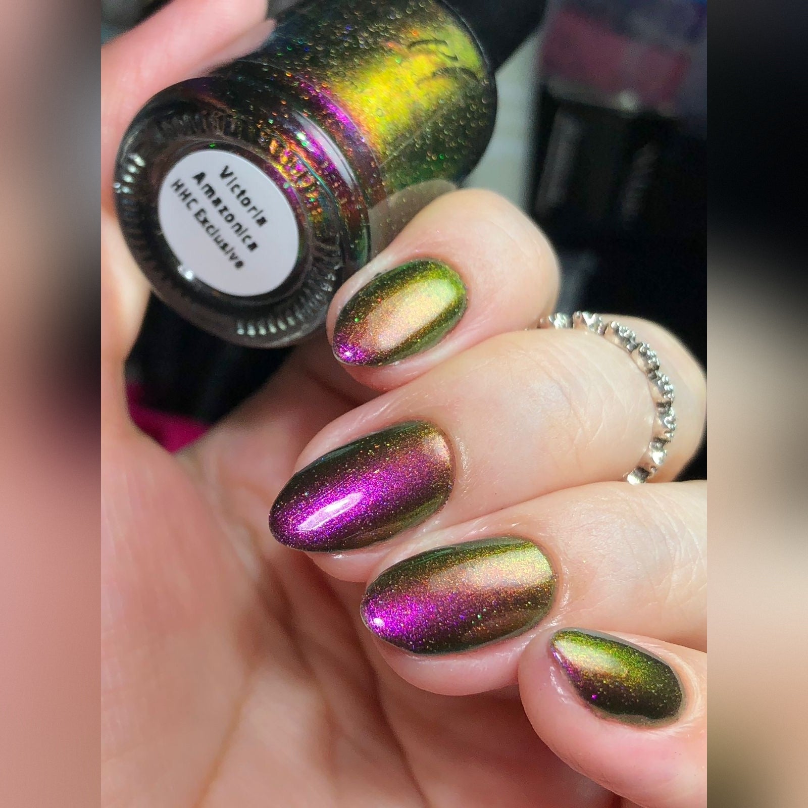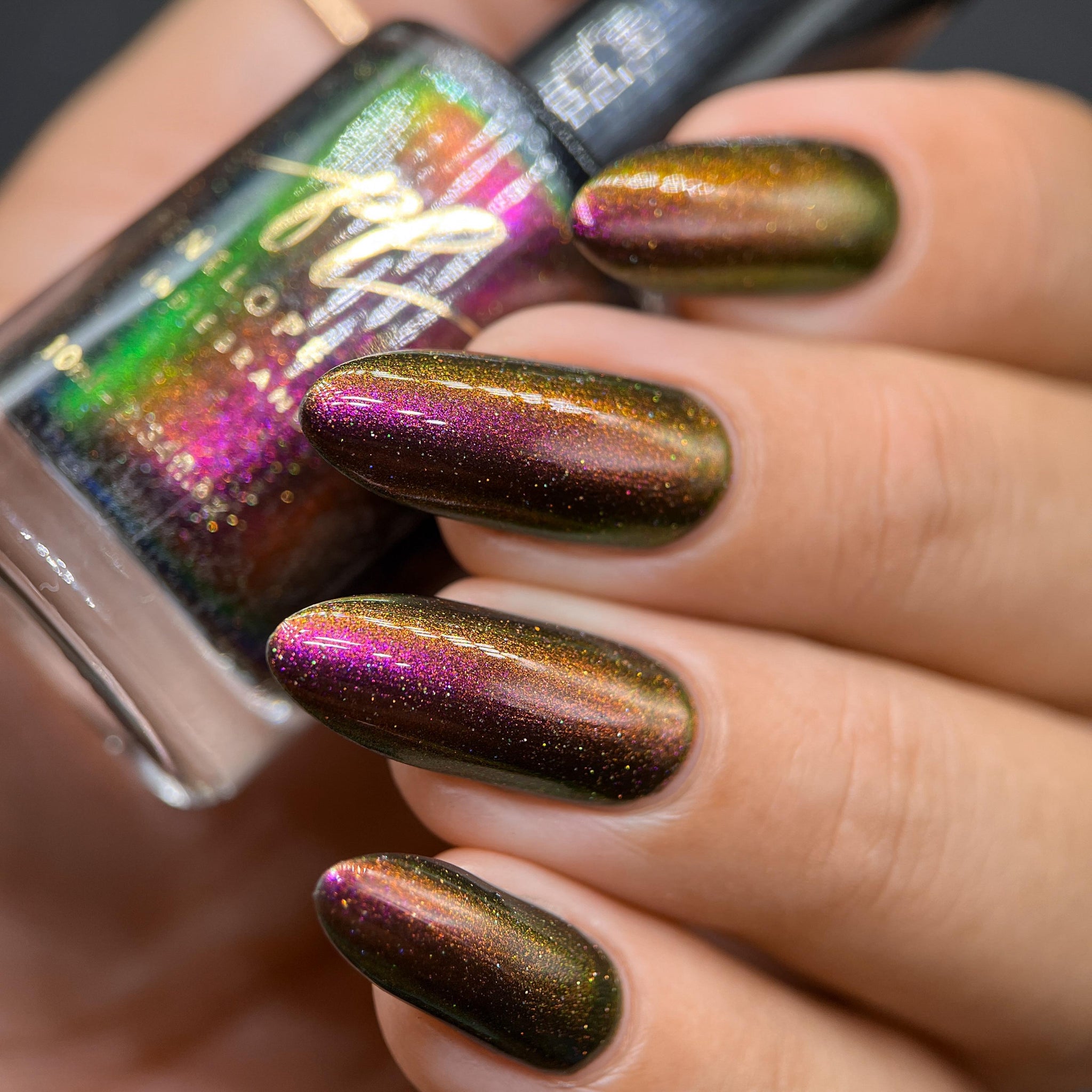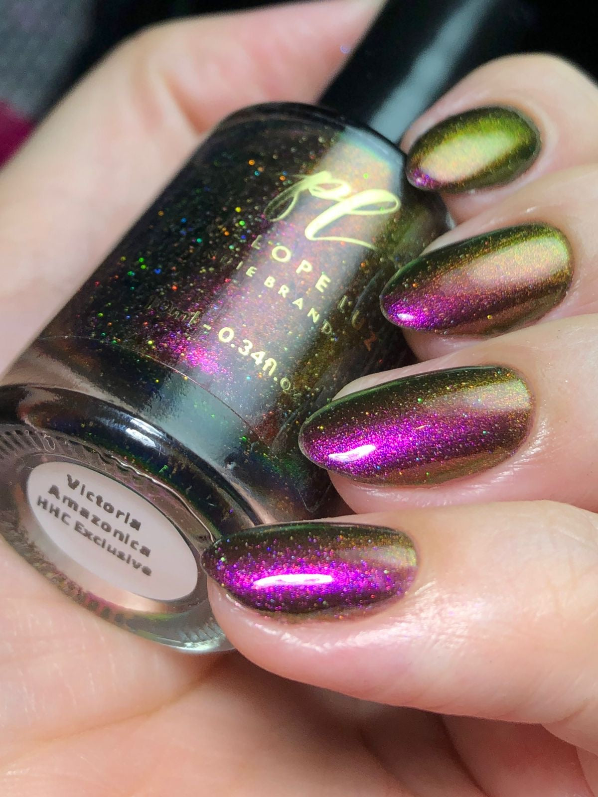 "Victoria Amazonica" is a multichrome pink/red/cooper/gold/green with black base.