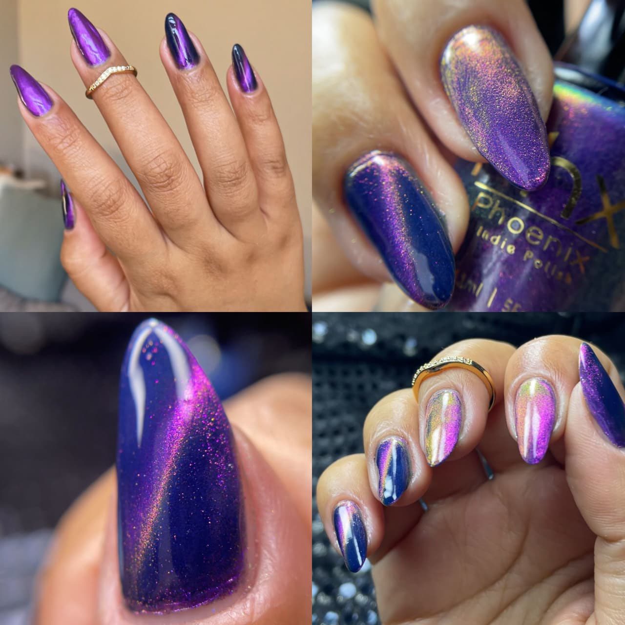 "Above the World" has a has blue jeans base with magnetic pink to golden and green.