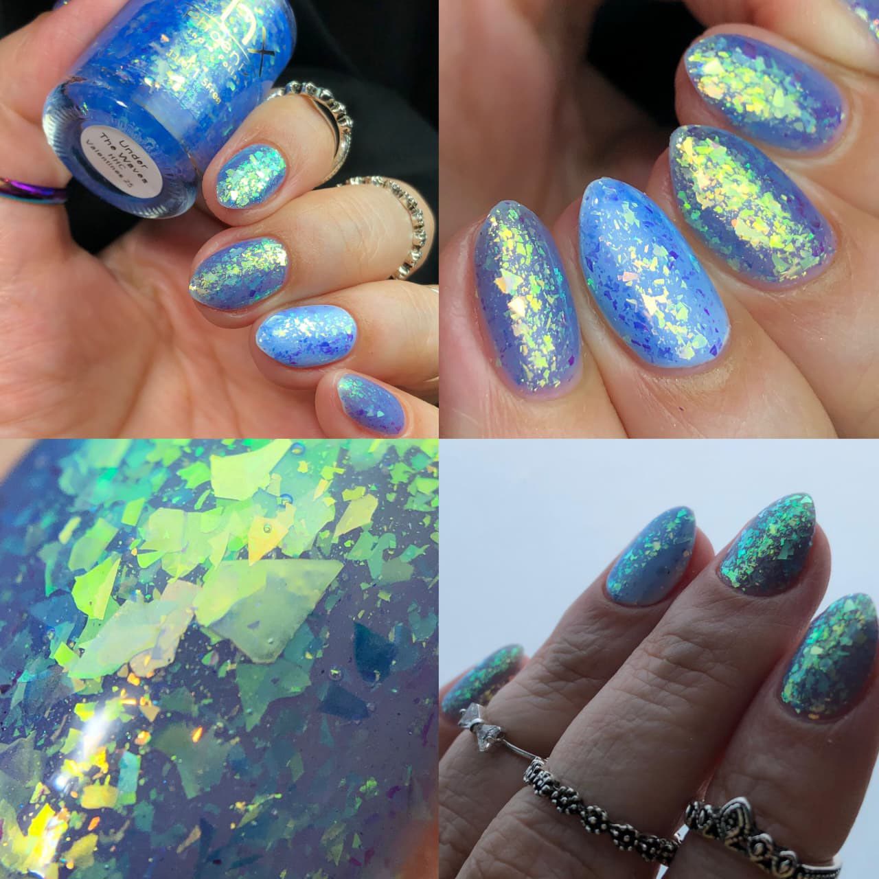 "Under the Waves" has a baby blue jelly base with golden/green/turquoise iridescent flakies.