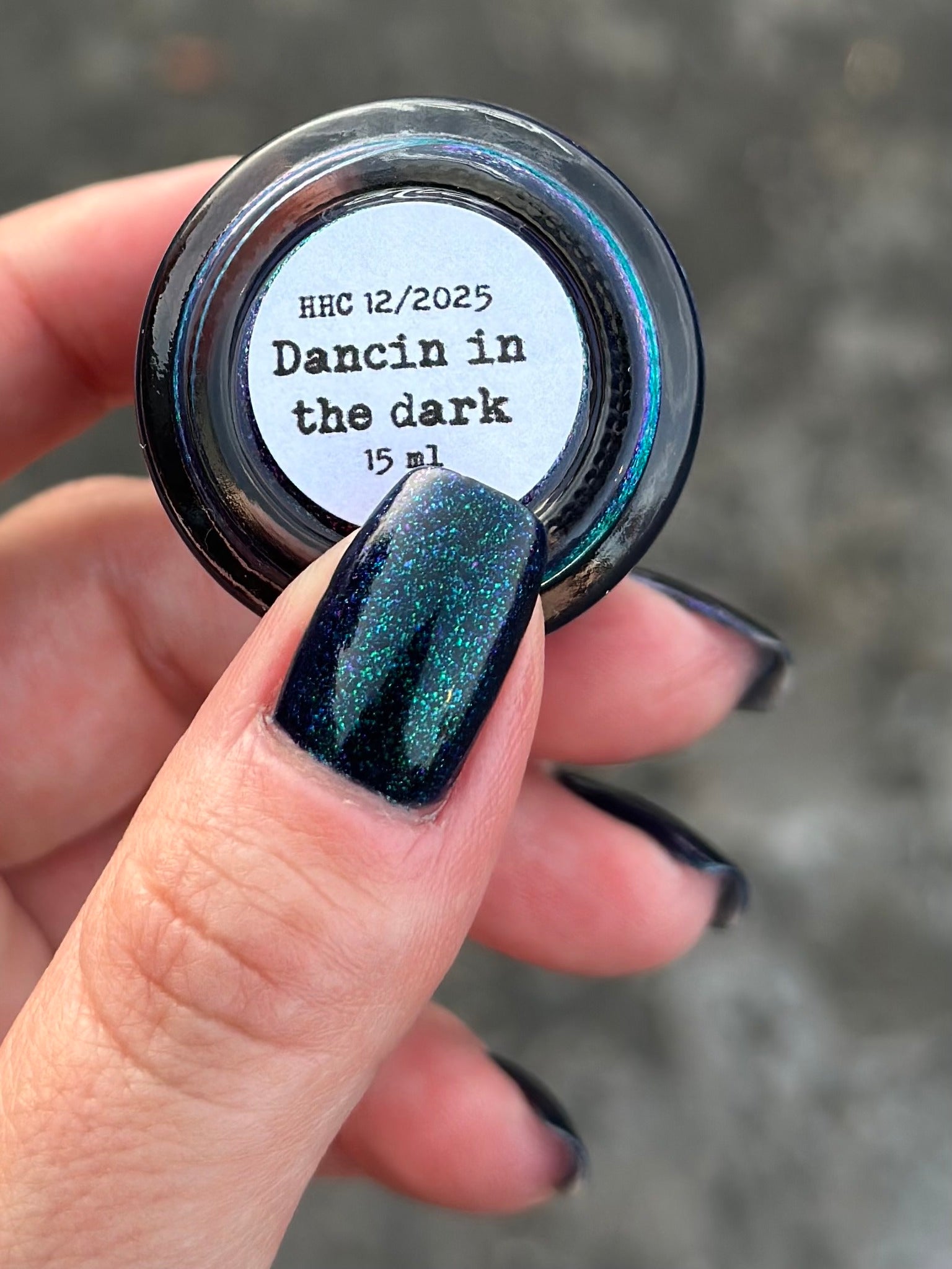 "Dancin in the Dark" has a dark navy base with a sparkly green/blue/violet shimmer.