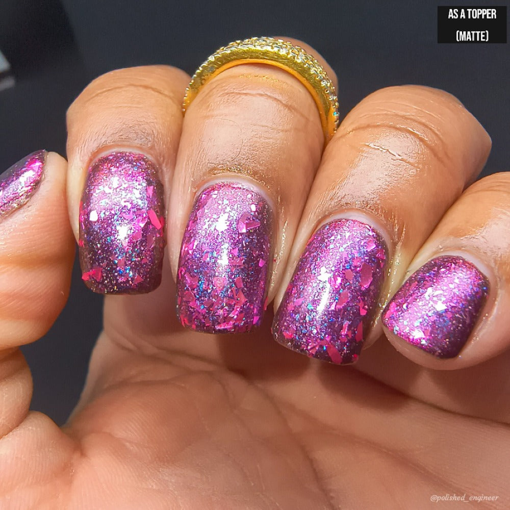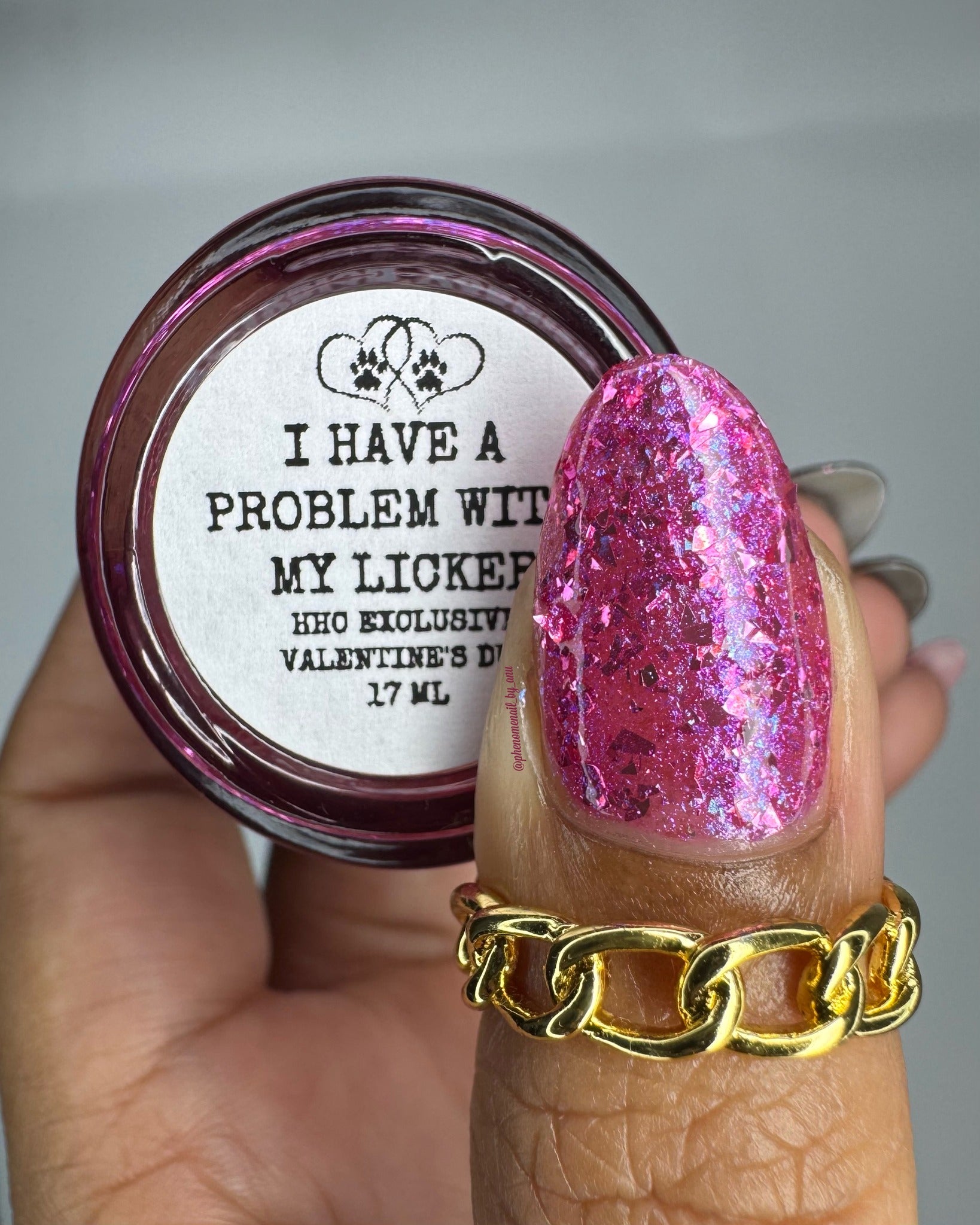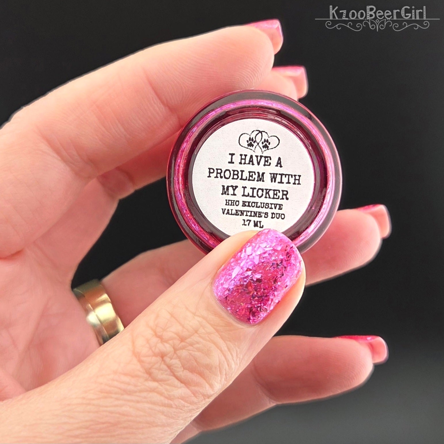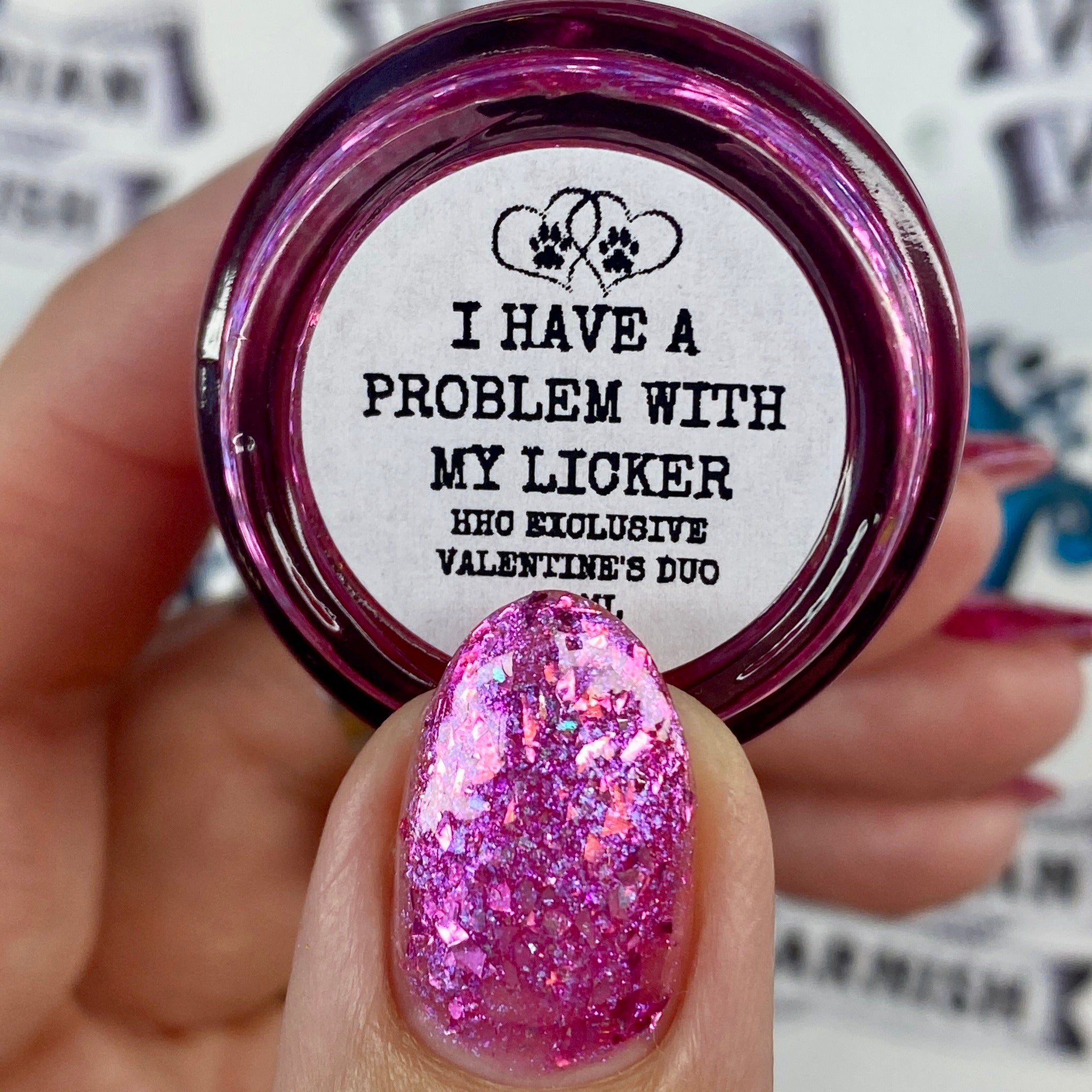 "I Have A Problem with My Licker" has a pinky sheer base loaded with pink to silver metallic flakes and Ghost flakies. Perfect by itself or top it over It’s Ruff Under the Covers.