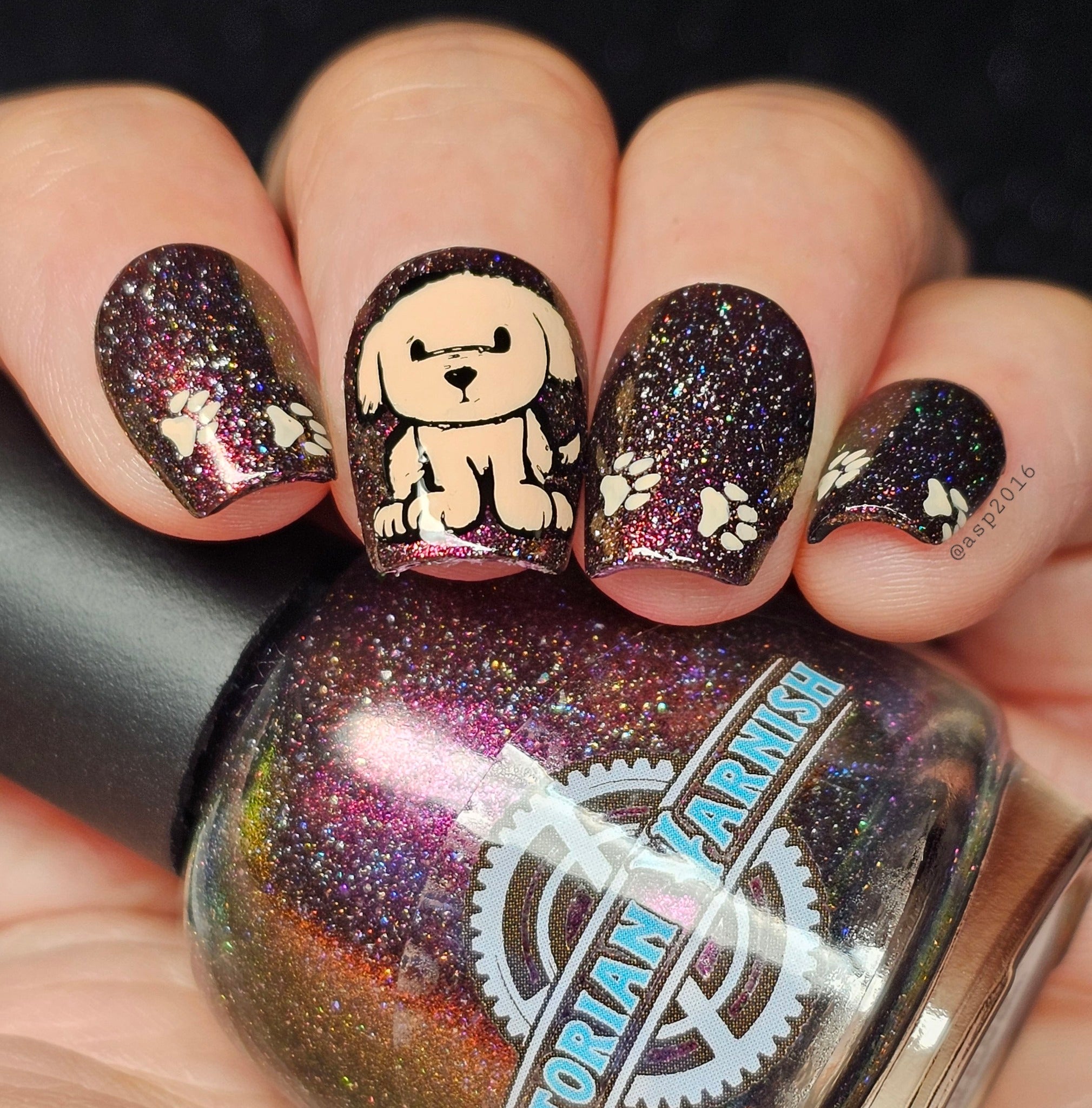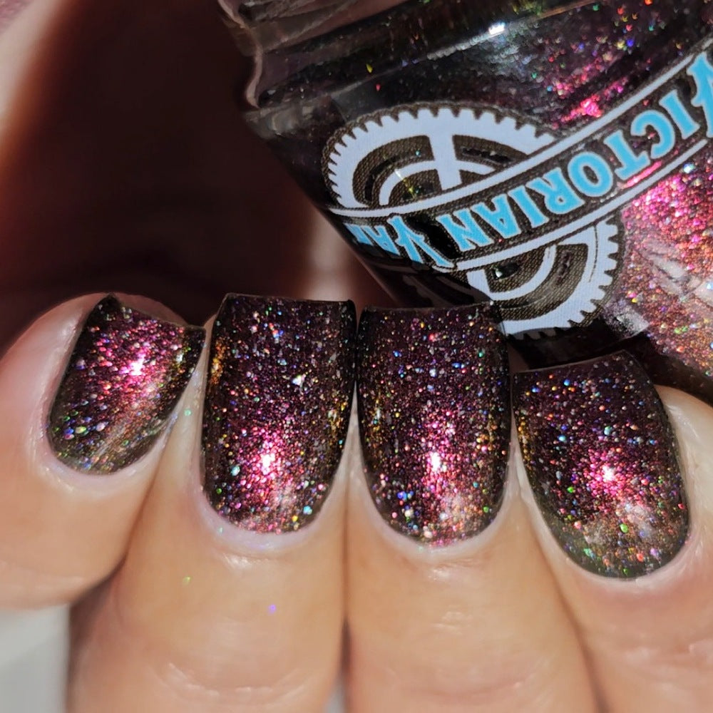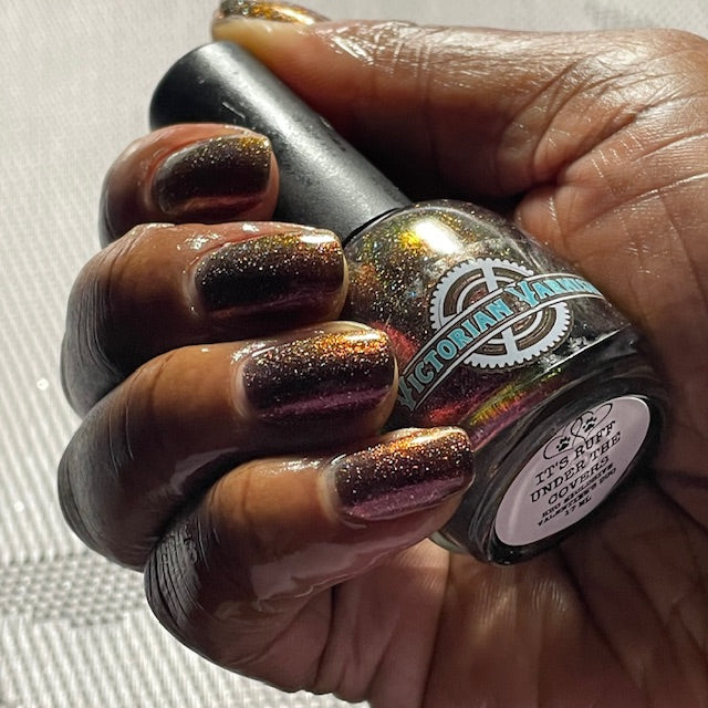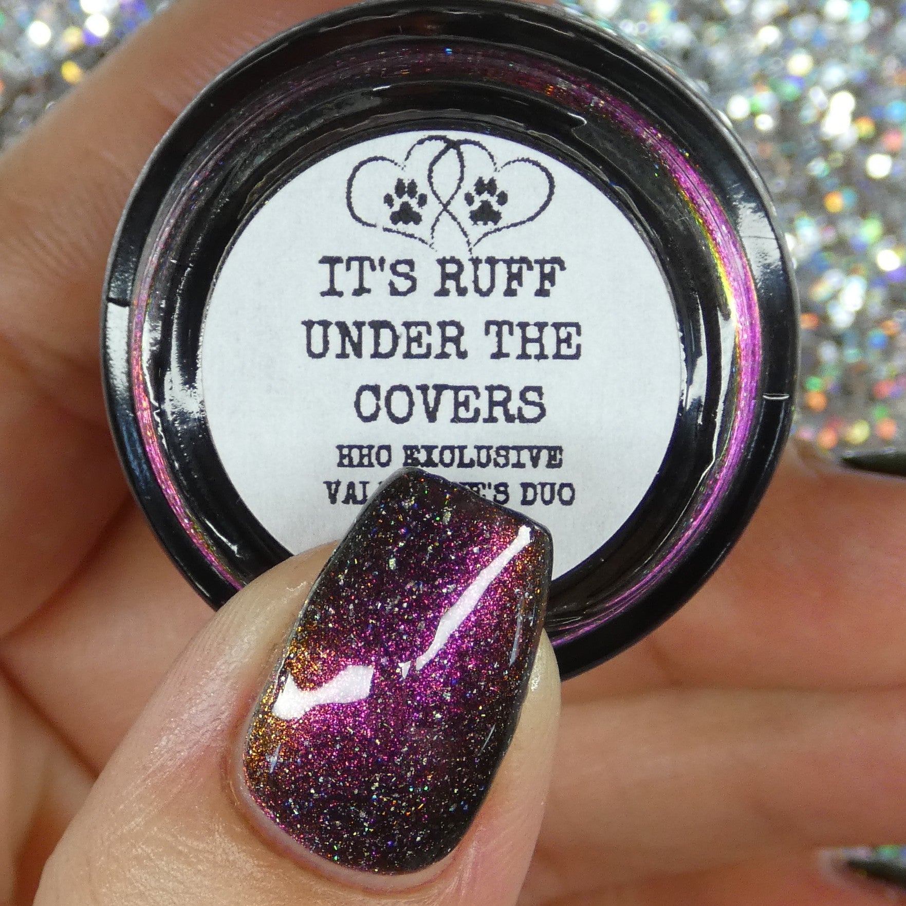 "It's Ruff Under the Covers" has a smoky black jelly base loaded with intense red/violet/pink/peach/bronze aurora shimmer and a paw-ful amount of holo.