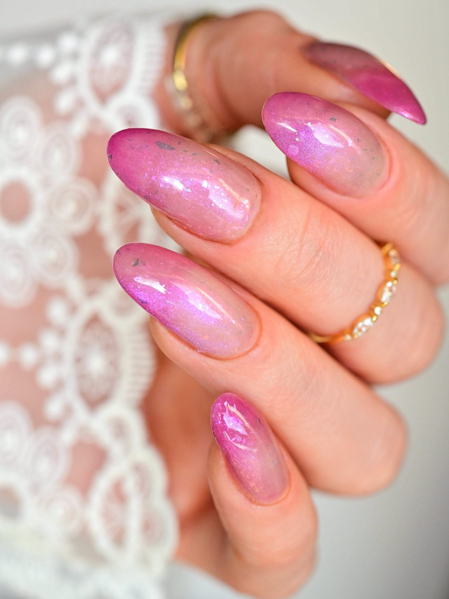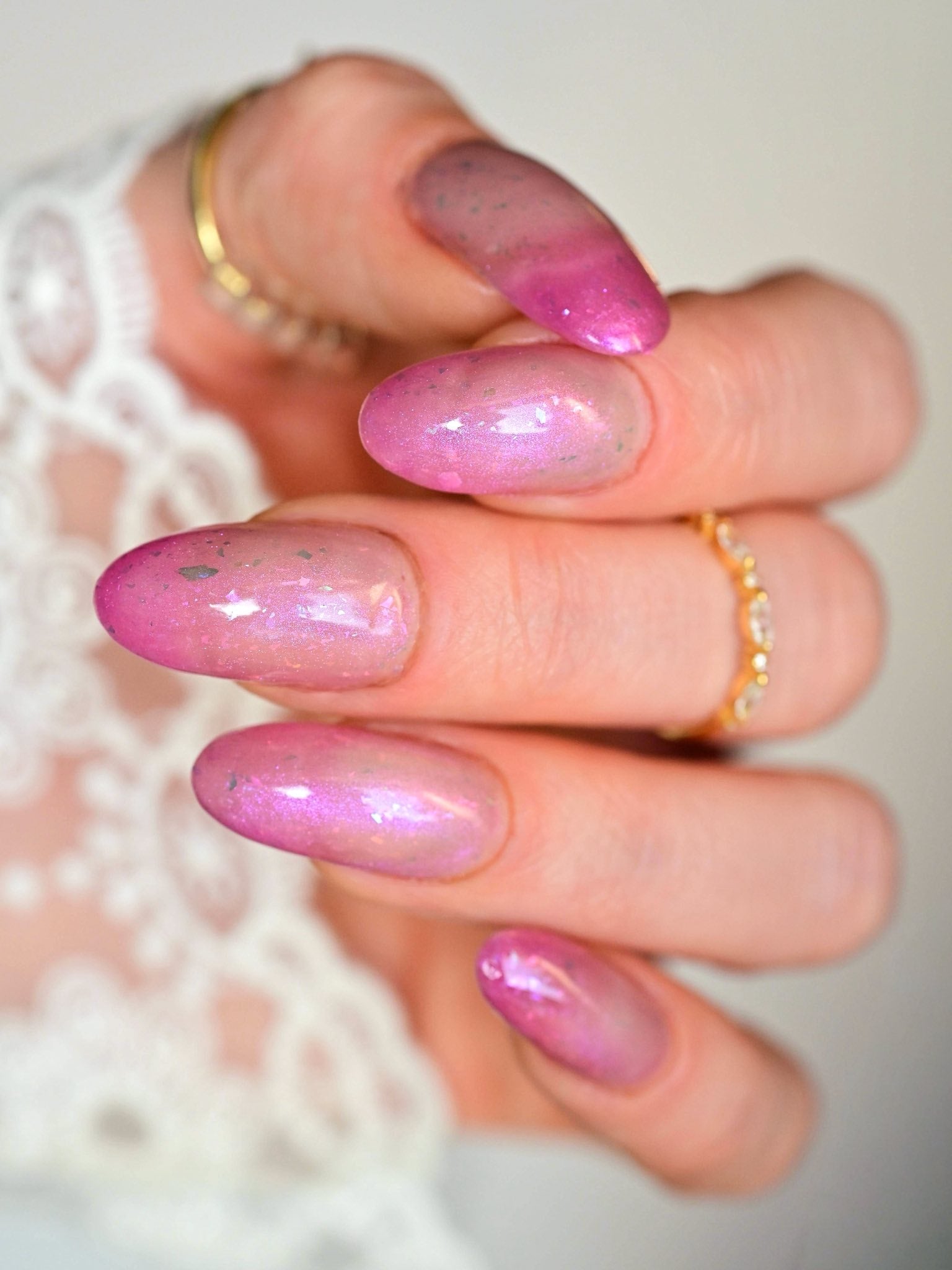 "Freyja" is a pink to colorless thermal with purple/pink/blue/red ghost flakies and a purple/pink line when magnetized.